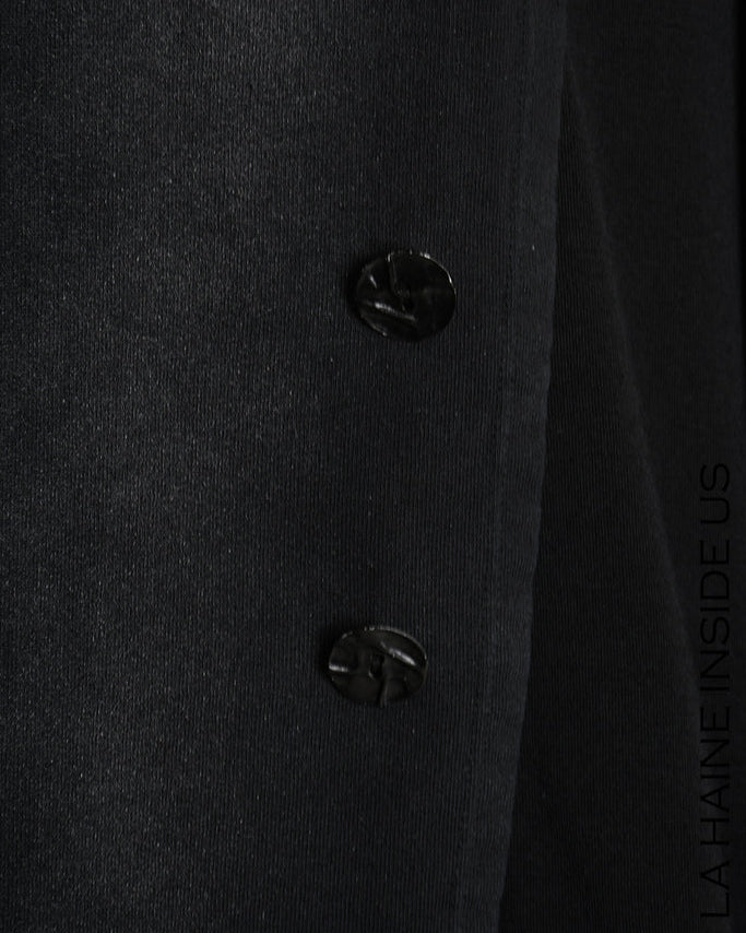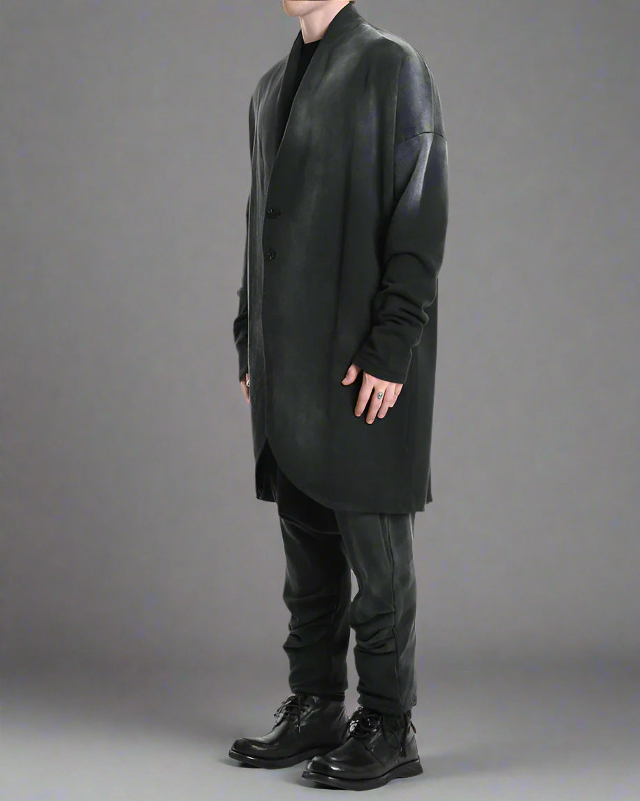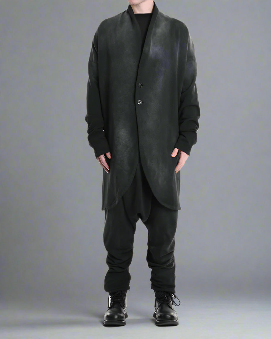 Charakterystyczny asymetryczny krój, zapięcie na guziki oraz unikatowe wykończenie w postaci czarnego, cieniowanego efektu corrosion nadają kardiganowi wyjątkowego, lekko awangardowego charakteru. Doskonały wybór do stylizacji casualowych i streetwearowych.