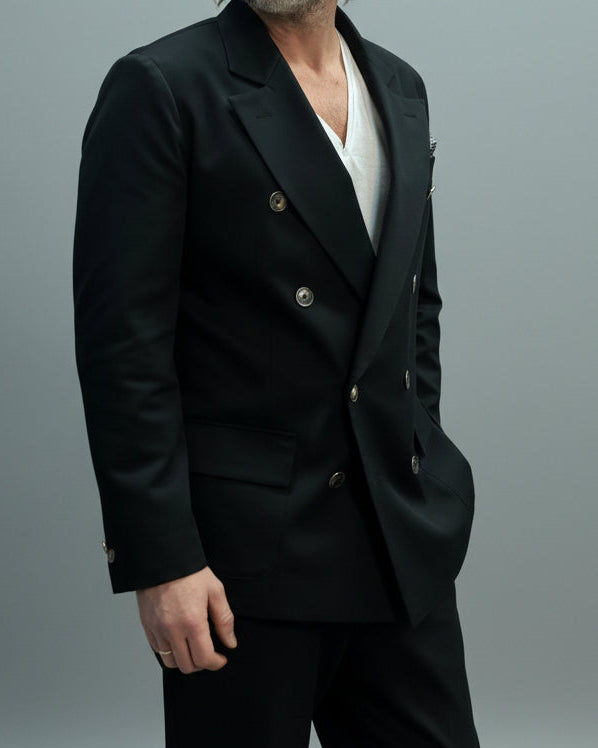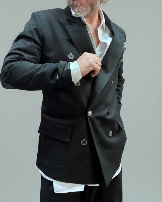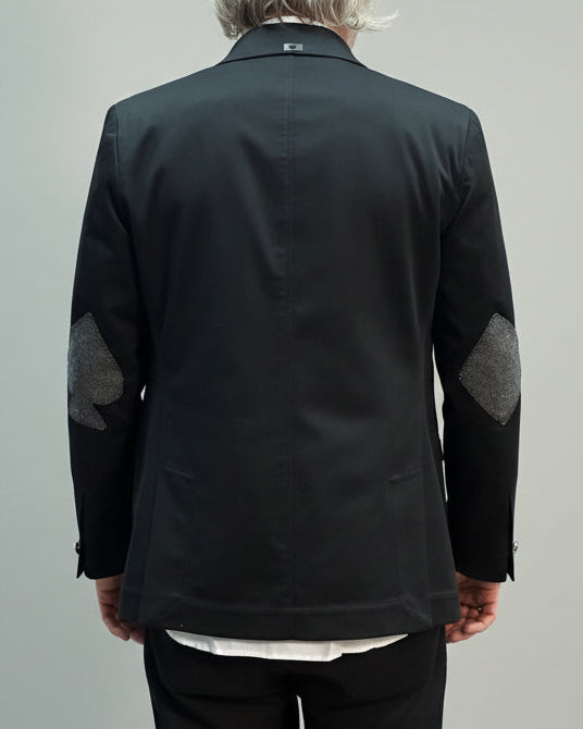 Wykonana z czarnej połyskującej bawełny z dwoma rzędami kontrastujących guzików i charakterystycznymi naszyciami na łokciach w kształcie pik i kier. Dzięki temu męski styl nabiera nowego znaczenia.