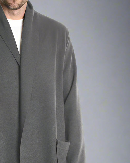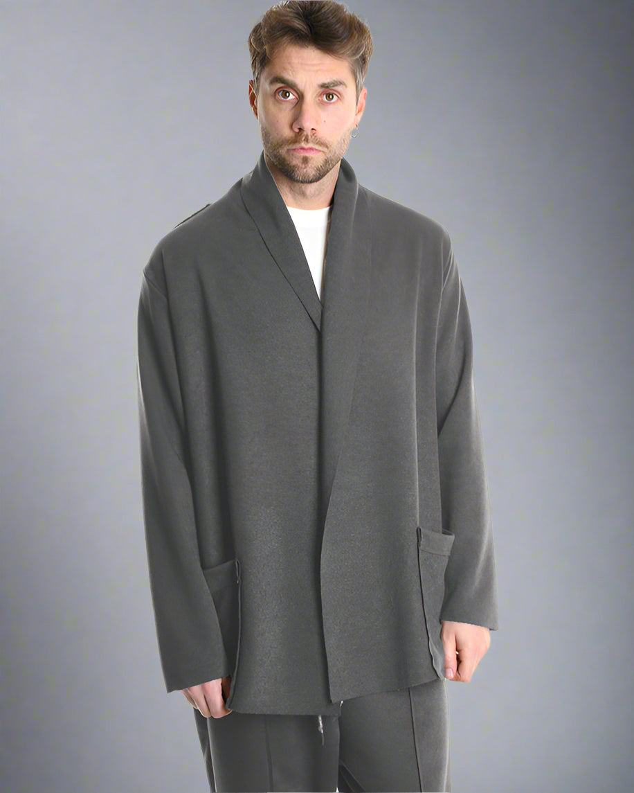 Długi kardigan z włoskiej kolekcji, wykonany z elastycznej mieszanki wiskozy, poliestru i elastanu, łączy wygodę z wyrafinowanym stylem. Luźny krój z surowo wykończonymi krawędziami i szerokim kołnierzem szalowym nadaje mu nowoczesnego, swobodnego charakteru. Praktyczne kieszenie dodają funkcjonalności, a lekka, miękka tkanina zapewnia komfort noszenia.