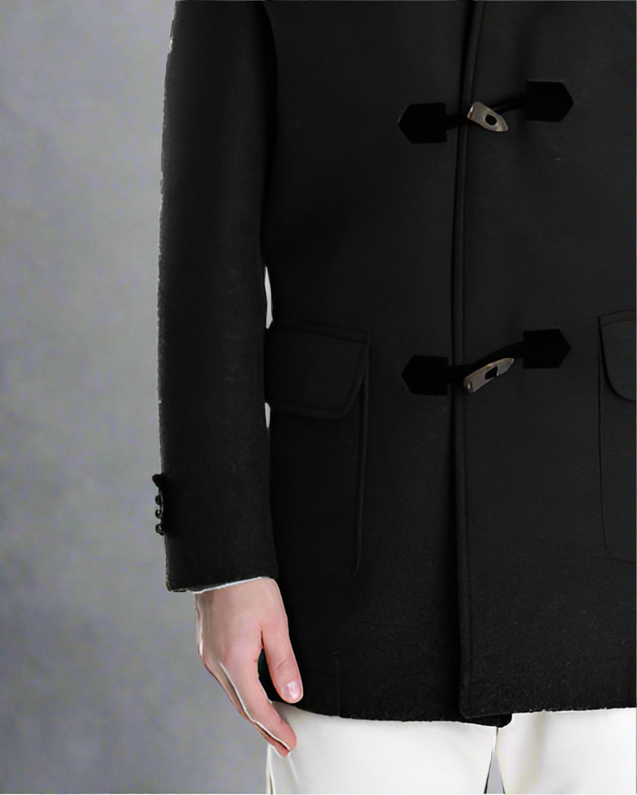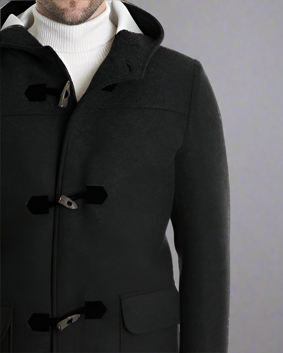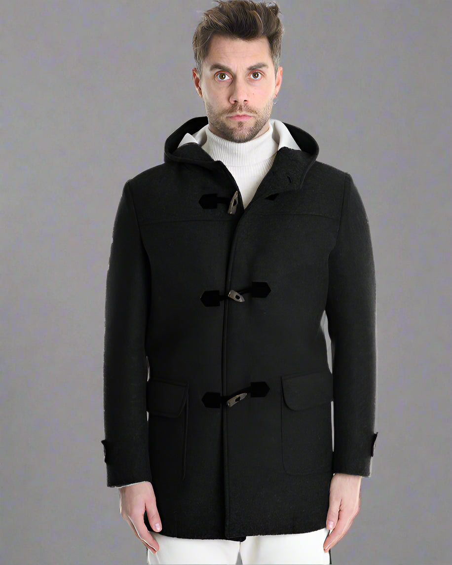 Charakterystyczne zapięcie na alamari oraz kaptur dodają płaszczowi tradycyjnego uroku, a praktyczne kieszenie zapewniają funkcjonalność. Ten model to doskonały wybór dla osób ceniących klasyczny design z nutą elegancji, idealny do zestawów casualowych i smart-casualowych, które wyróżniają się stylem i wygodą.